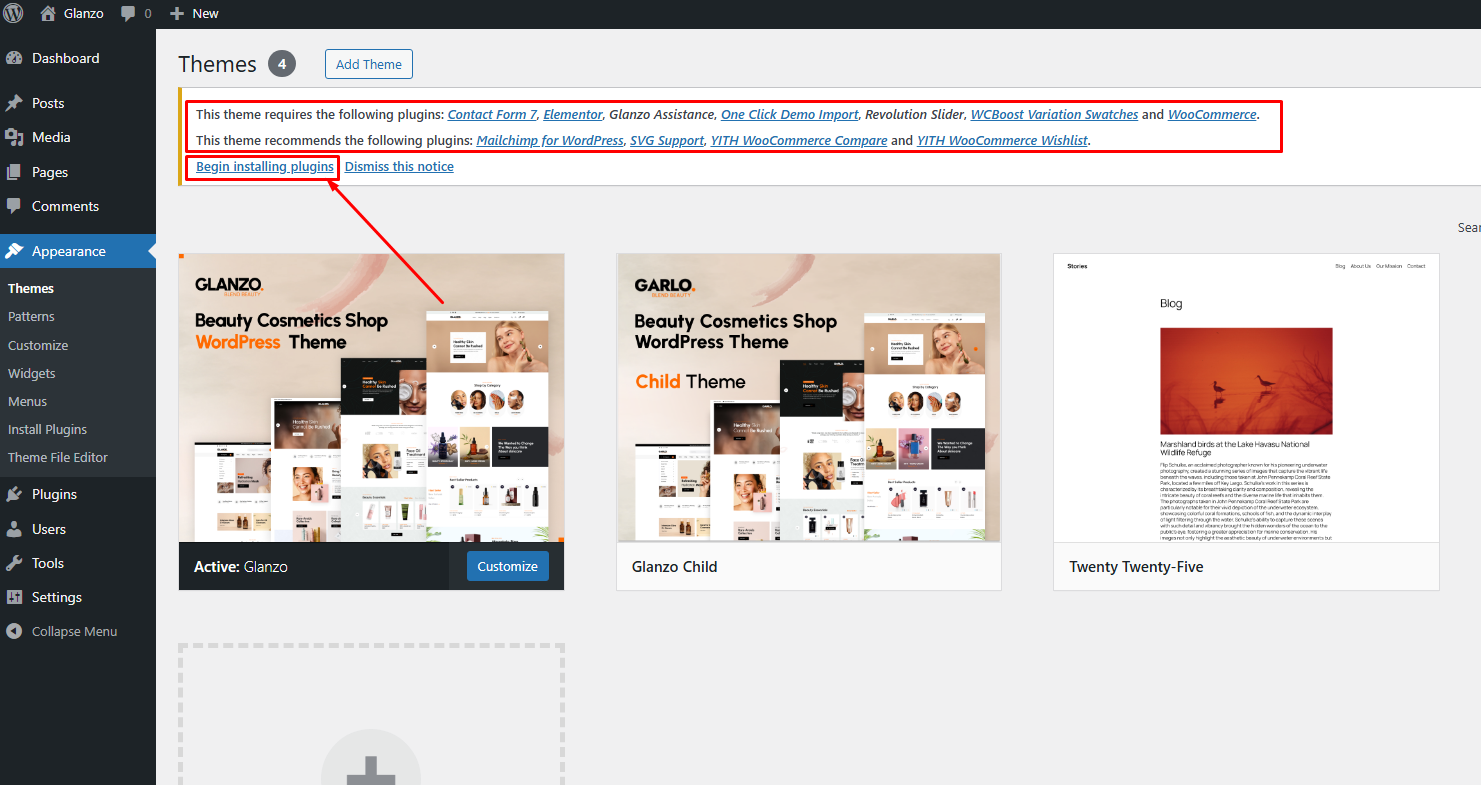the Glanzo theme, you will see a notification in your WP dashboard.