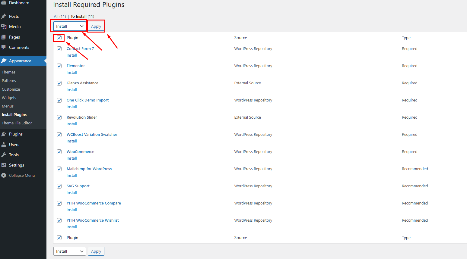 Select all plugins by checking all the checkboxes. Select 'Install' from the bulk