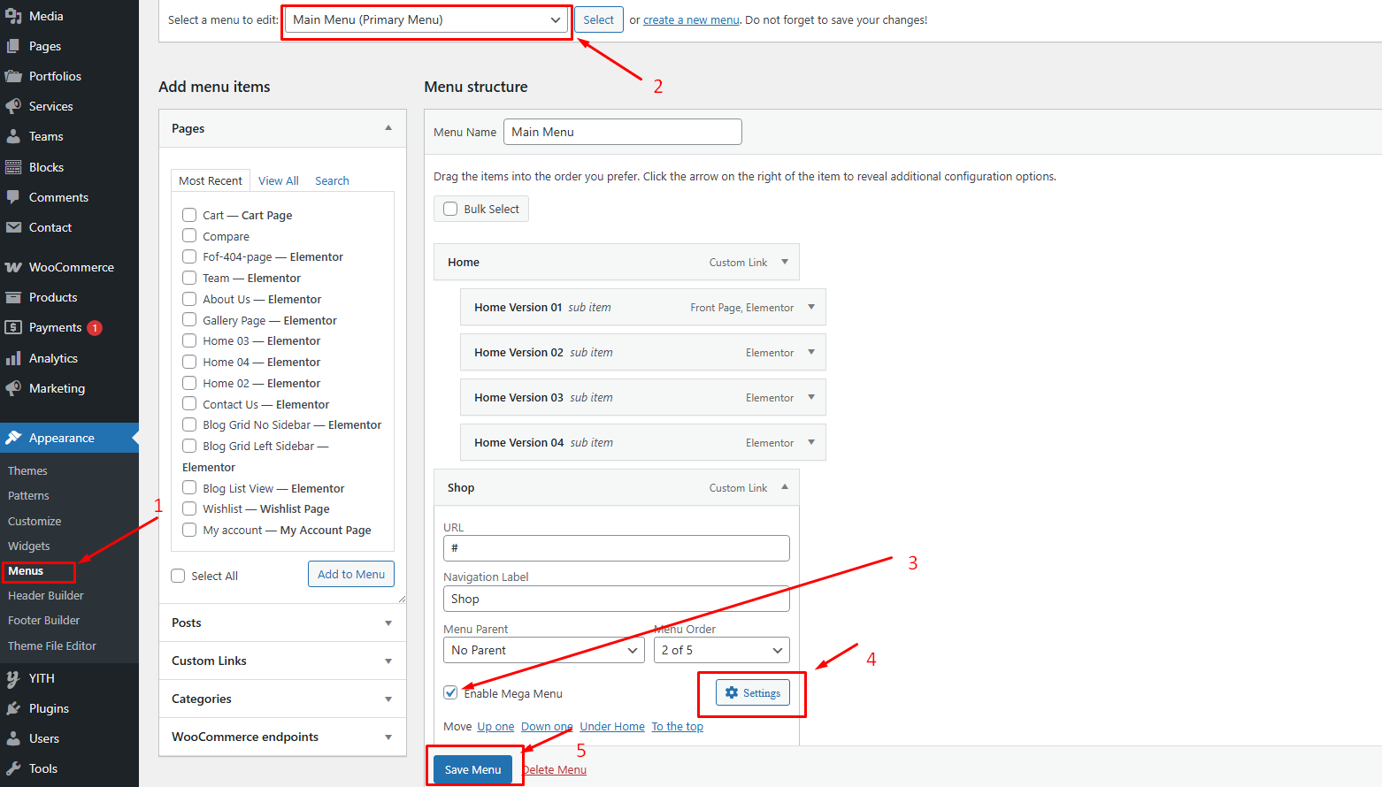 To set up the header mega menu, go to Appearance → Menus →
